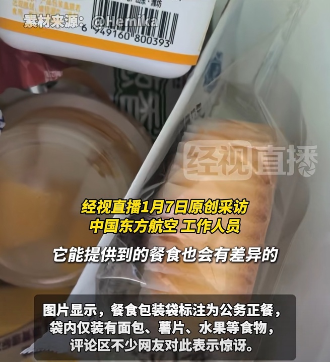近日,有网友发帖吐槽中国东方航空正点公务舱的餐食过于简单。从该网友发布的图片来看,餐食包装袋标注“过夜公务正餐,仅限本次航班食用”,袋内仅装有面包、薯片、水果等食物。该帖子引发关注,评论区不少网友对此表示惊讶。